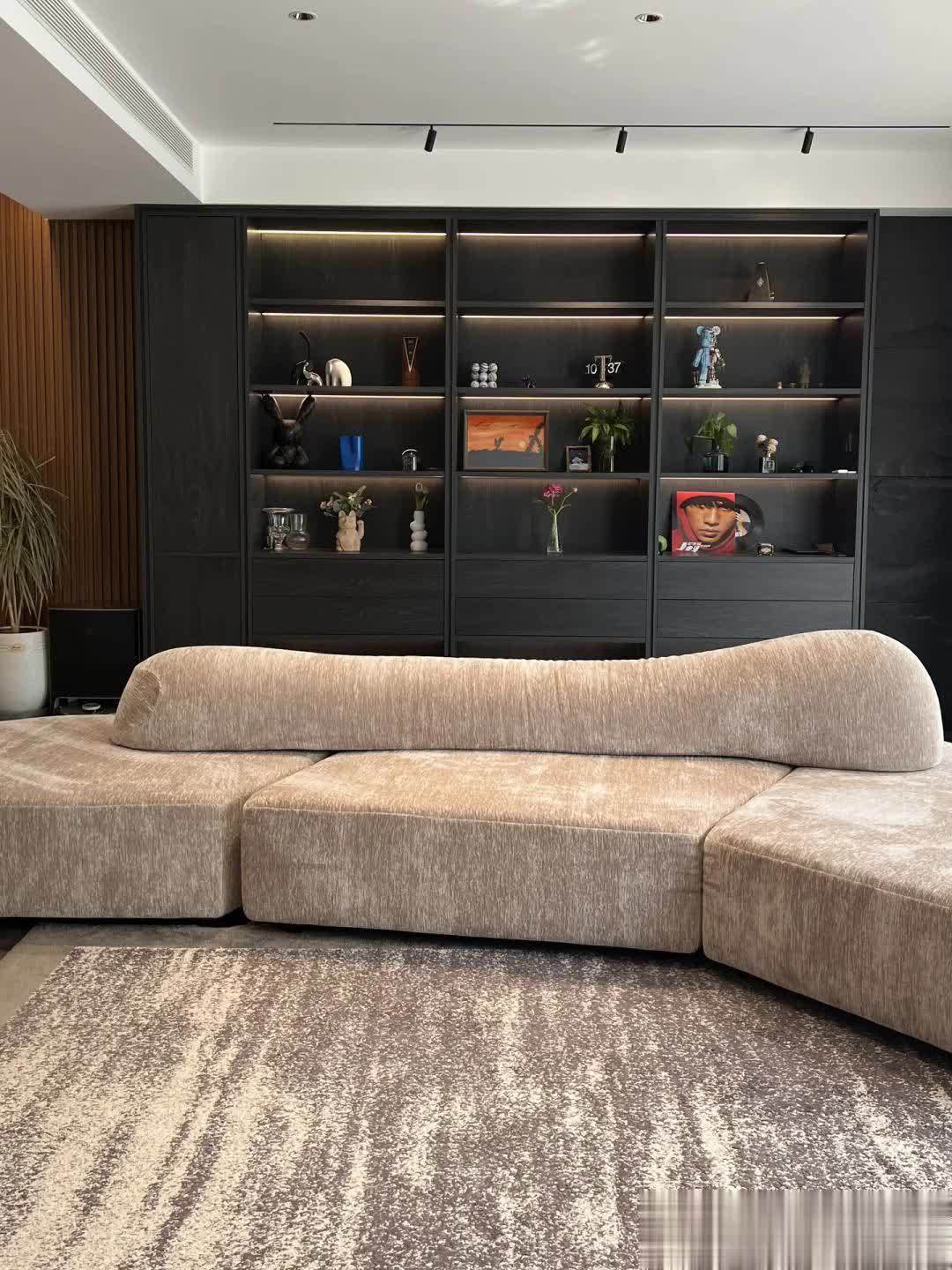 沙发背面靠墙,定制一组深色的木制储物柜,摆上书籍和展示品,高级且不失格调。