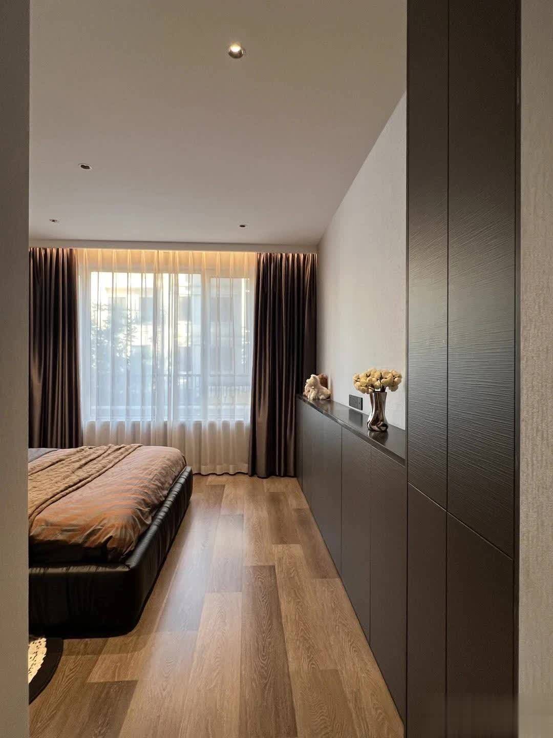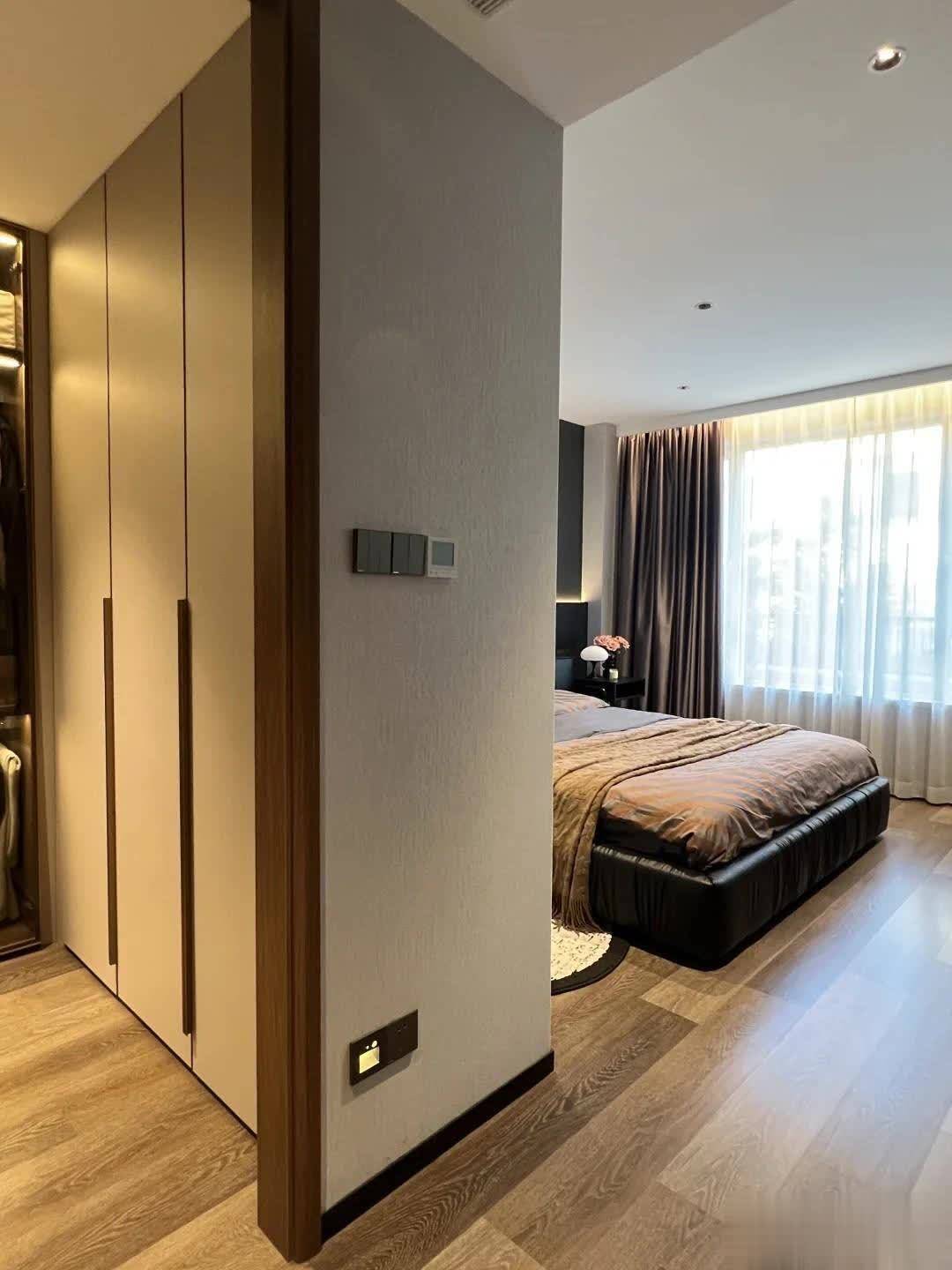 主卧是个套间,自带衣帽间和卫生间。地面铺设实木地板,墙面大面积留白,局部吊顶。