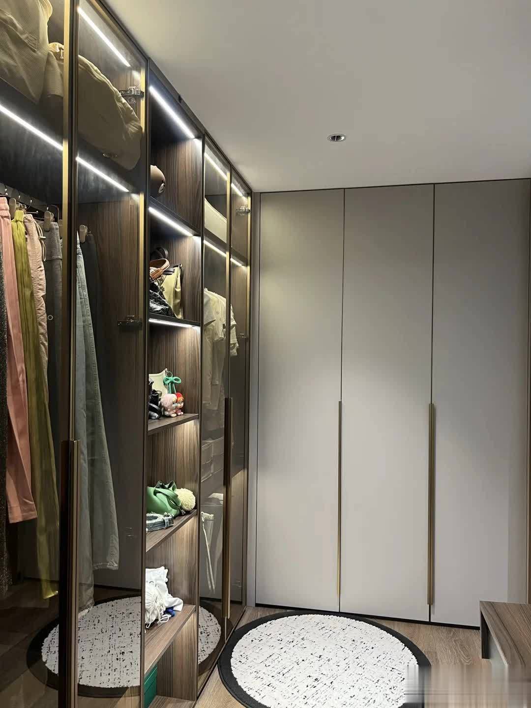 衣帽间与卧室一墙之隔,L型的储物柜设计,带玻璃的储物柜可以收纳当季衣物和包包,而白色柜门内,则可以放置换季的衣物和被褥。关上柜门,目之所及,干净整洁,空间感也明显提升。