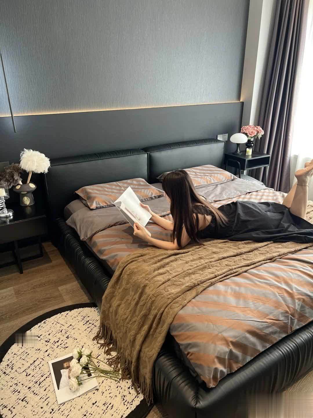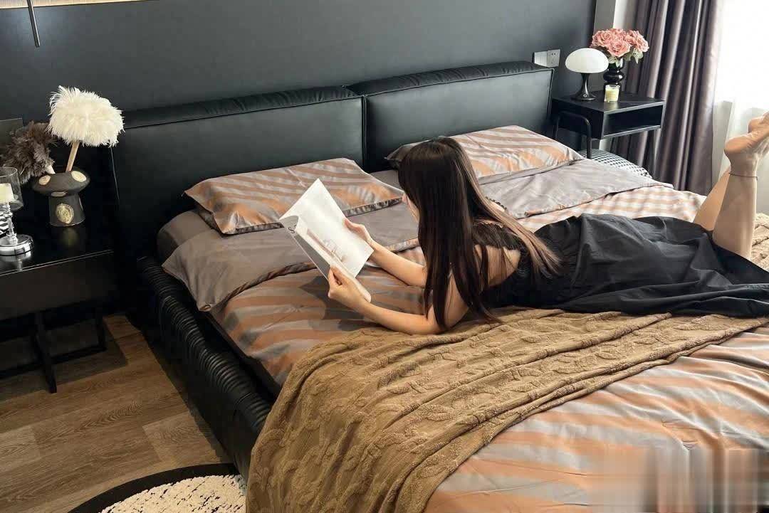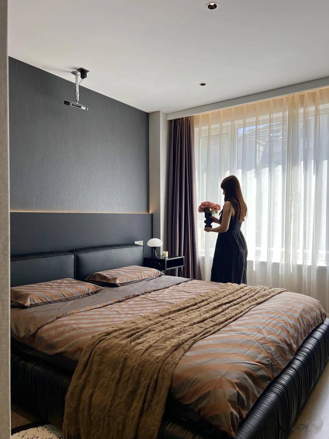 床头背景墙贴灰色墙纸,配深色皮质家具和浅咖色的床品,温润又有层次,虽然没有繁杂装饰和造型,却透着一股静谧治愈的松弛感。