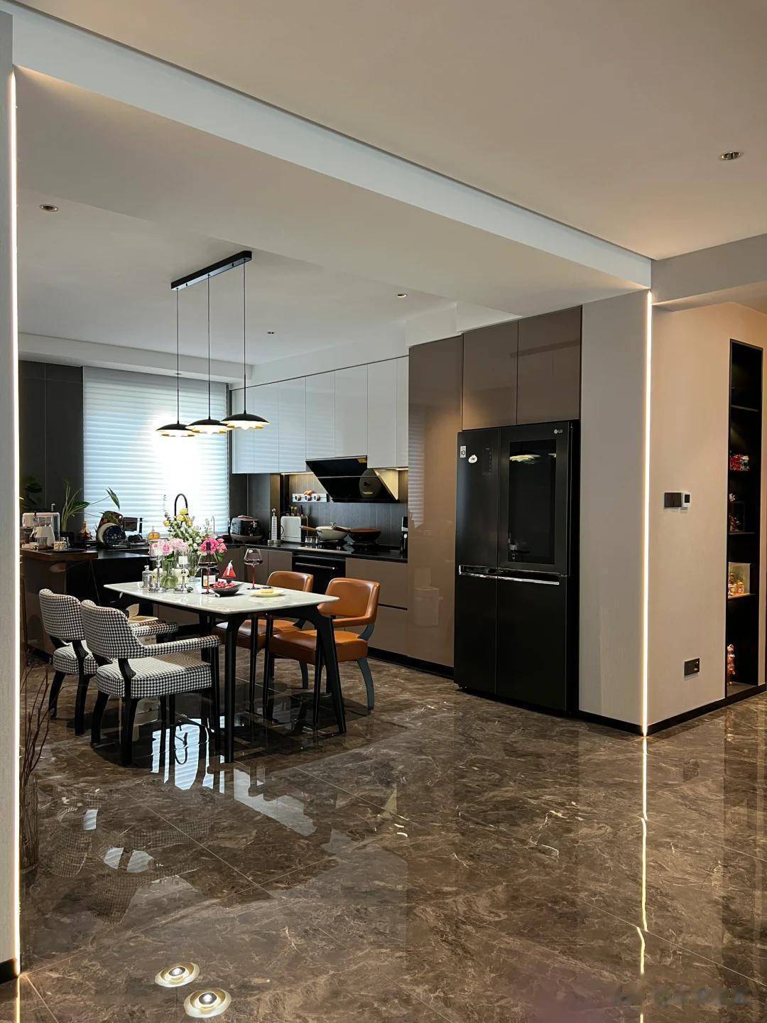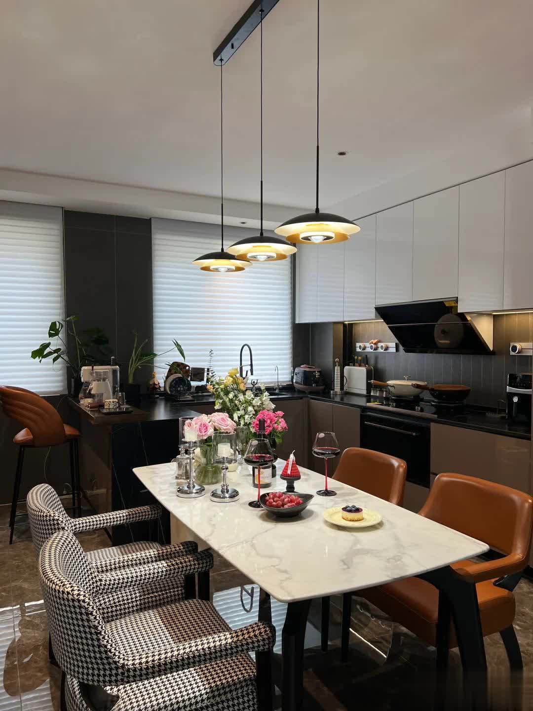 千鸟格和橘色的餐椅,搭配“飞碟”造型的吊灯,勾勒出餐厅的框架,而白色岩板餐桌上的高脚红酒杯摆件则无声地彰显着品味。