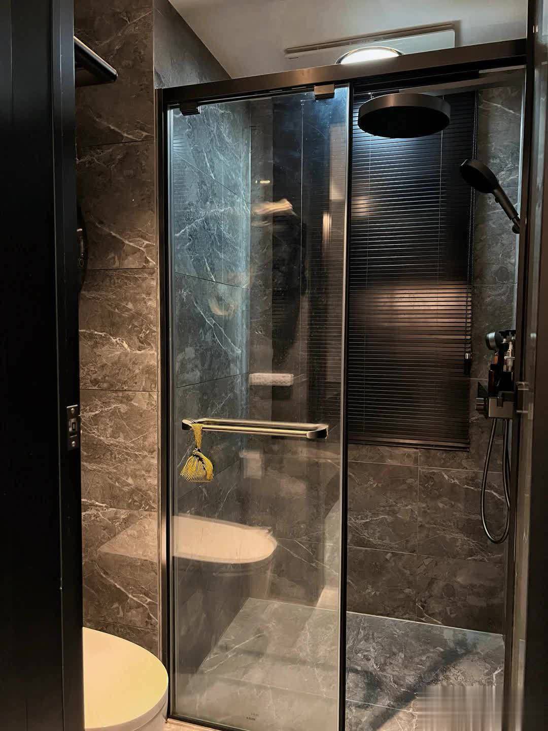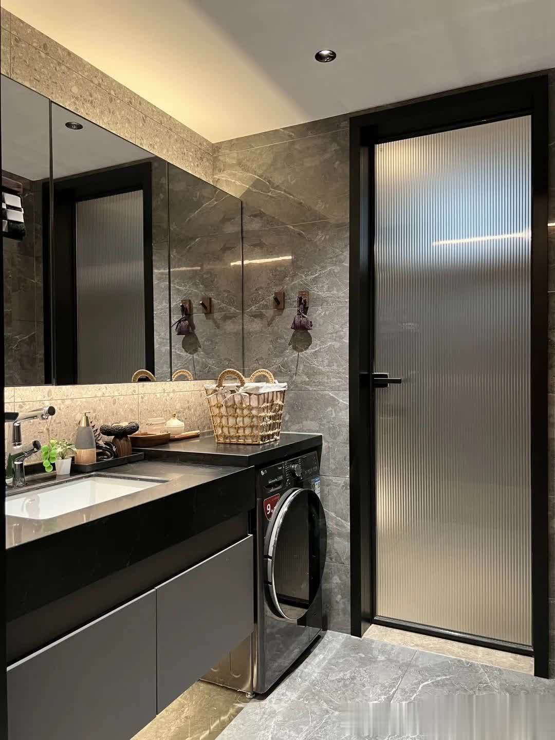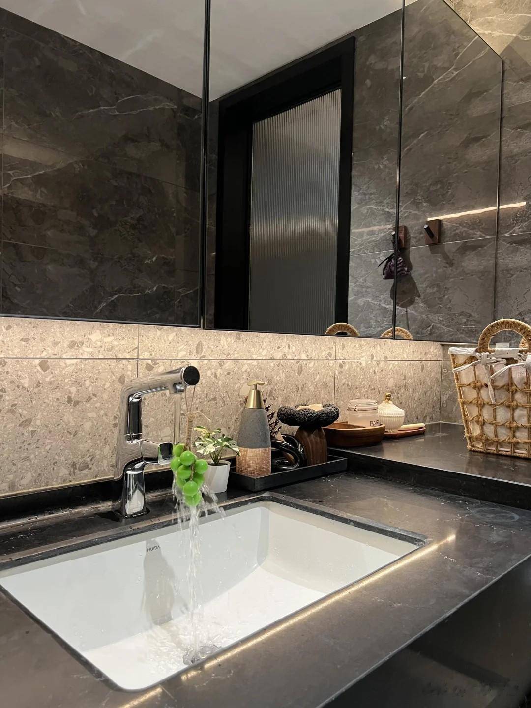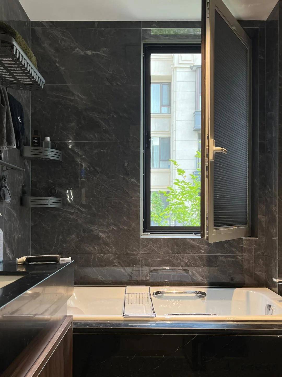 主卫与次卫基本保持一致,只是洗漱台融入原木色,与深灰石材营造出一份沉稳感,而充裕的空间置入浴缸,尽显豪华感。