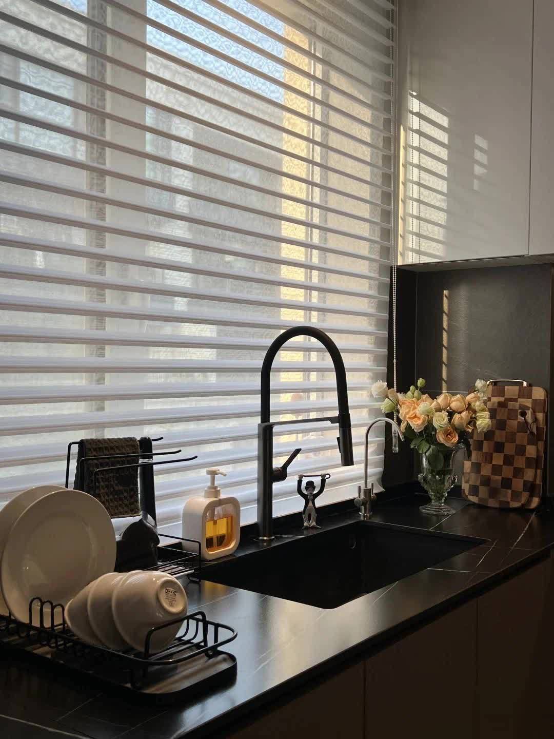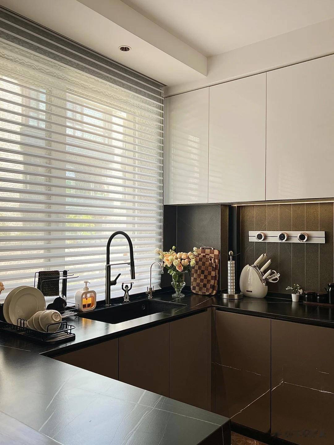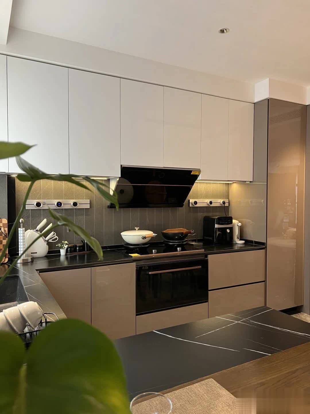 U型厨房提供了更多的操作台面和储物空间。香槟色和乳白色的橱柜与黑色岩板台面搭配,在视觉上提升了空间的高级感,也平衡了烟火气息空间可能存在的“油腻感”。