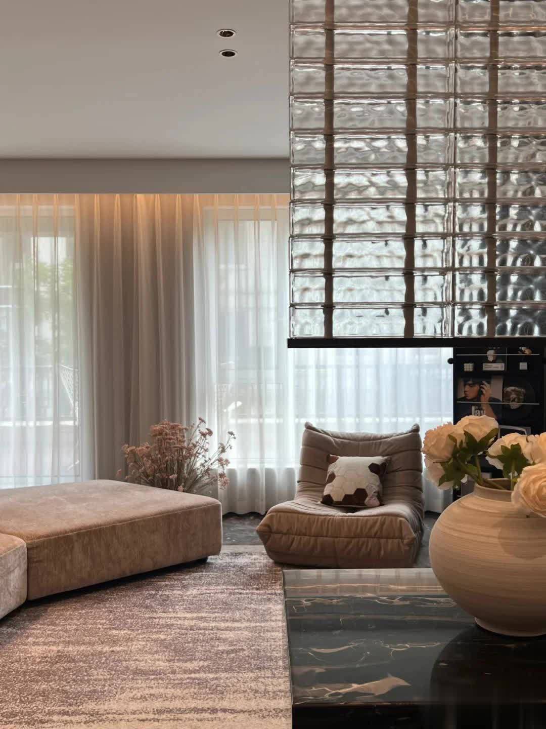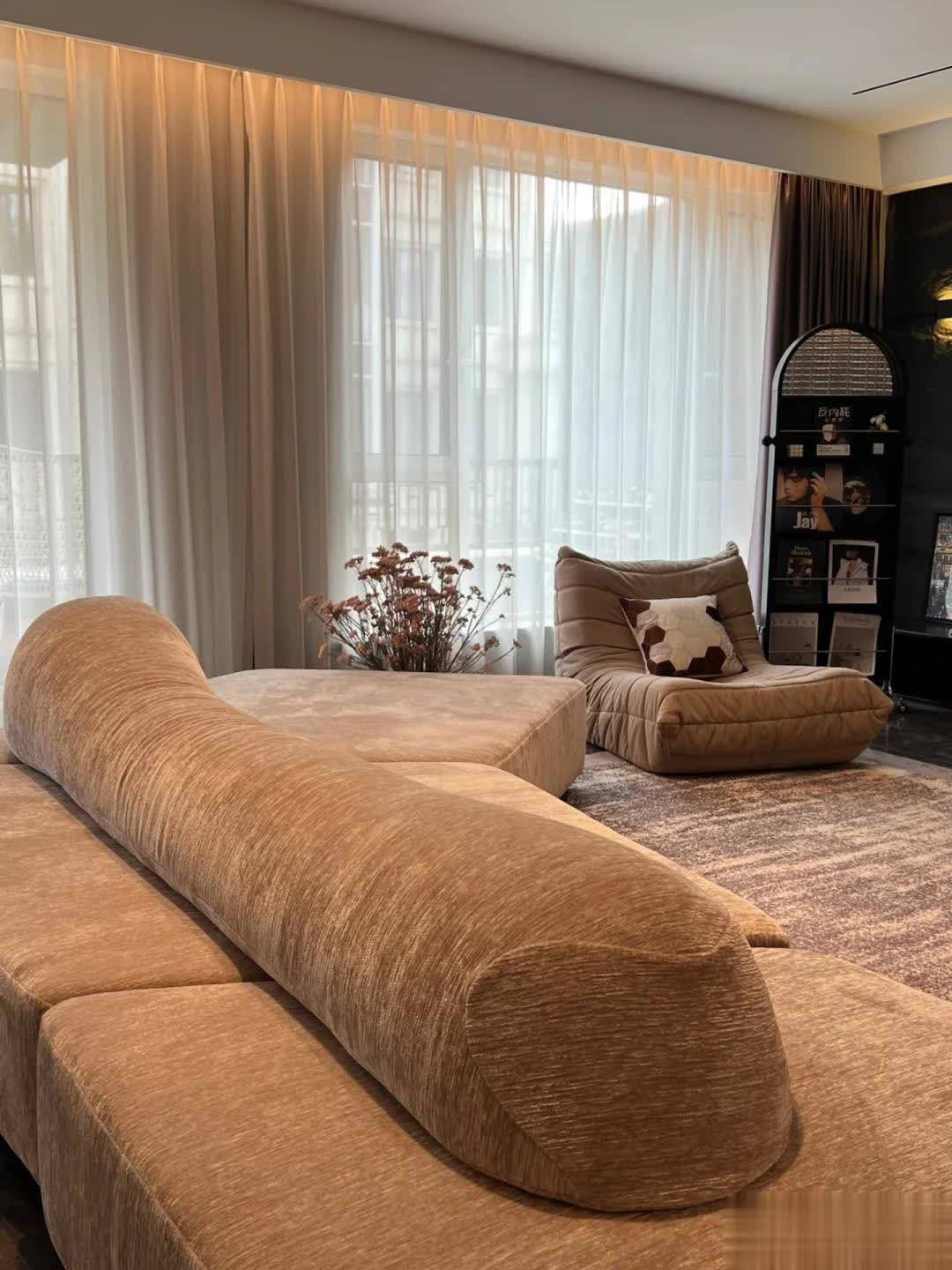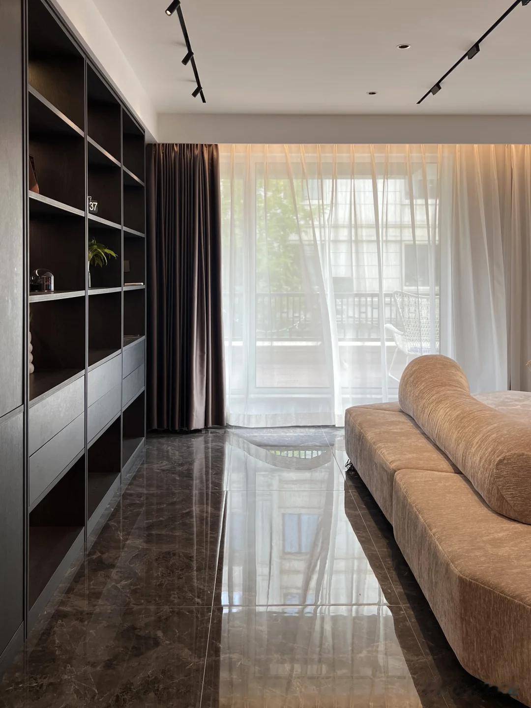 地面满铺咖色大理石肌理瓷砖,搭配同色系的布艺沙发与毛毛虫单椅,显得沉稳内敛又富有新意。而且这些家具都保持在较低的水平面,无论是坐、卧还是躺,都让生活状态更加舒适、休闲。