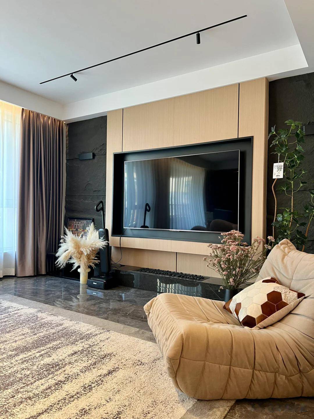 电视背景墙造型简约,以深色为基底,将电视机巧妙地嵌入式安装到“凹”造型中,看上去整洁大方。再搭配绿植和鲜花,带来一丝自然的气息。