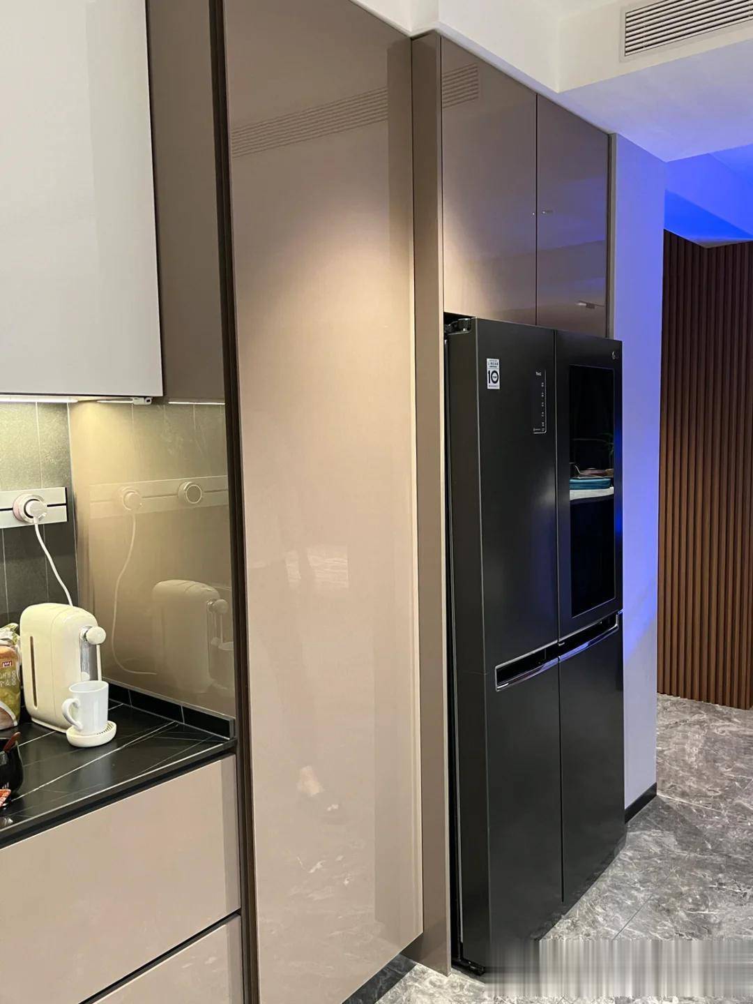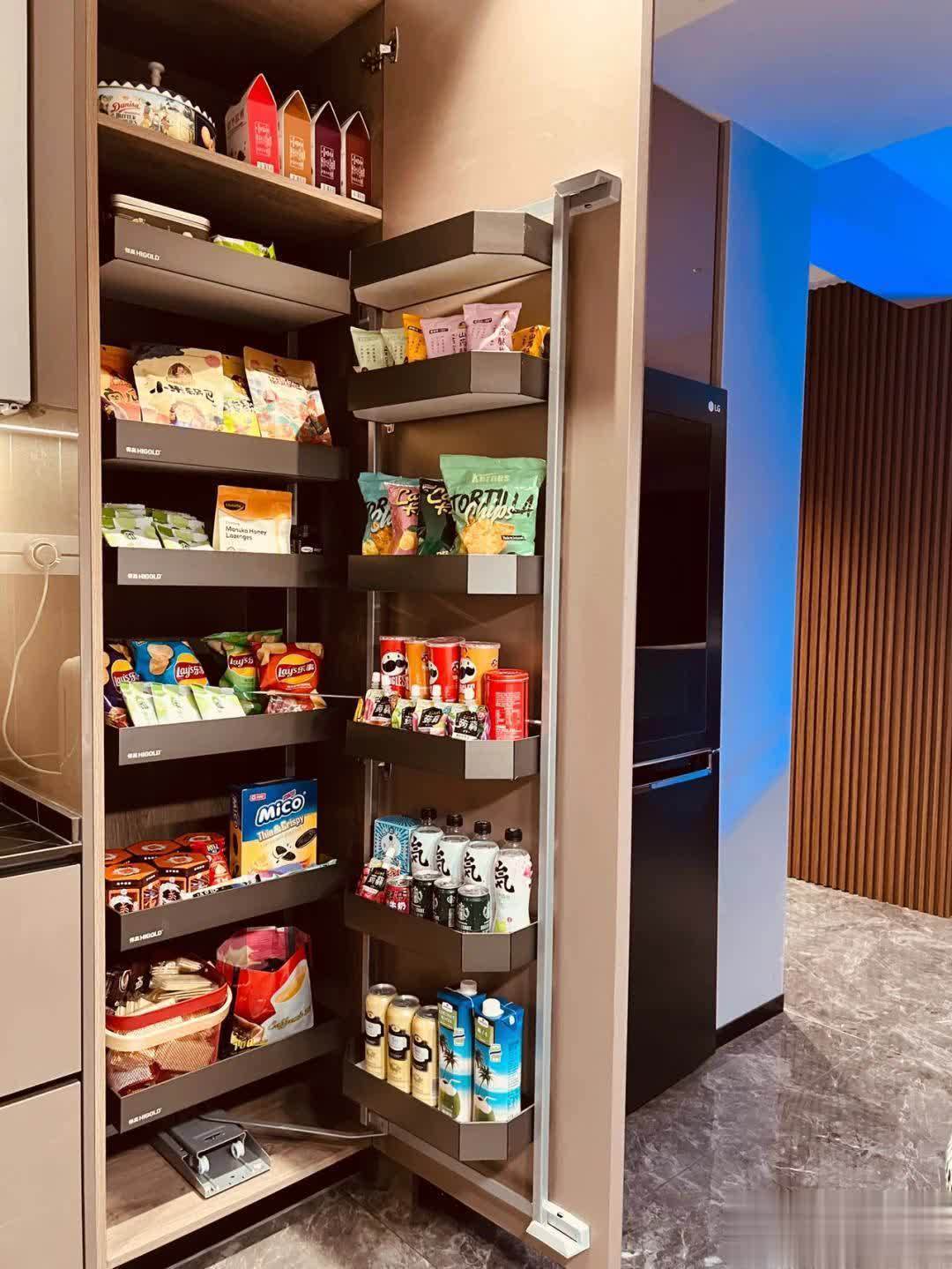 爱吃零食的小姐姐,在冰箱旁边的高柜内安装了一个置物架,塞满自己喜欢吃的食物。毕竟,自己的生活就得取悦自己,这样的设计让满足感和安全感十足。